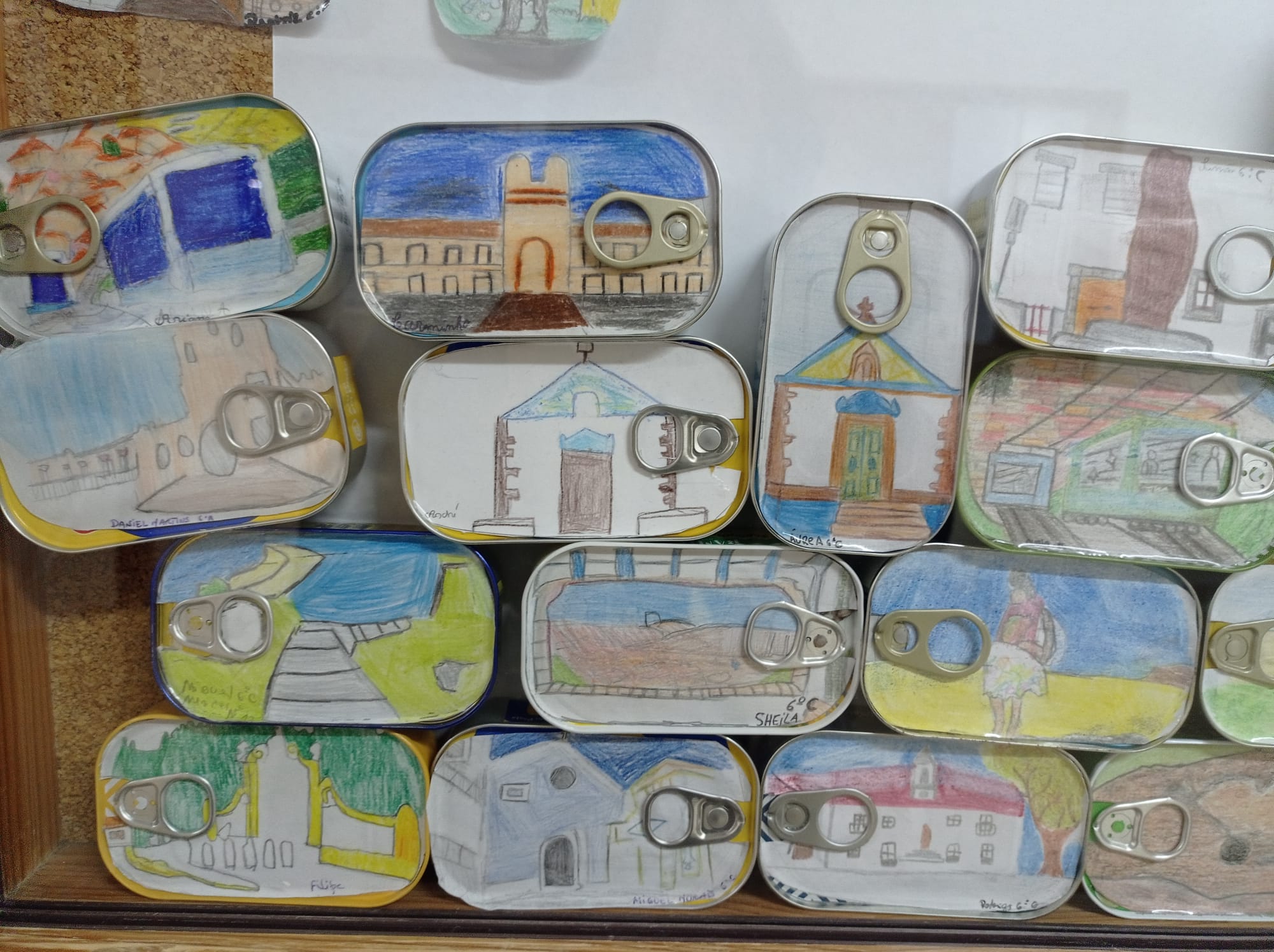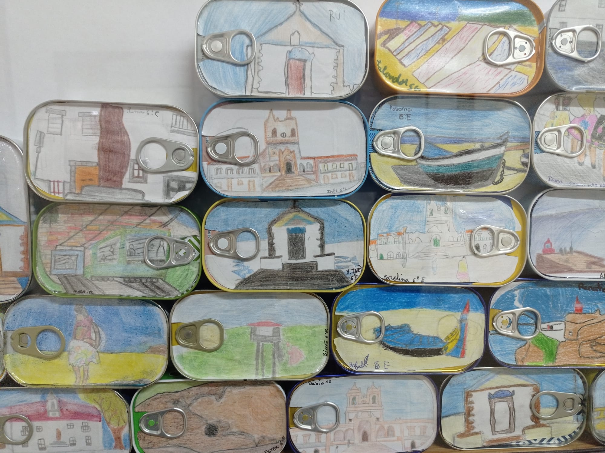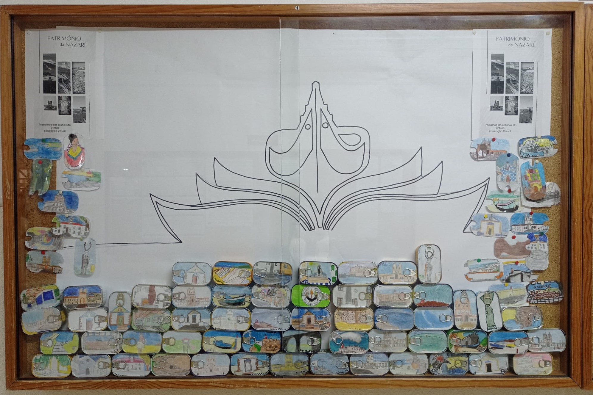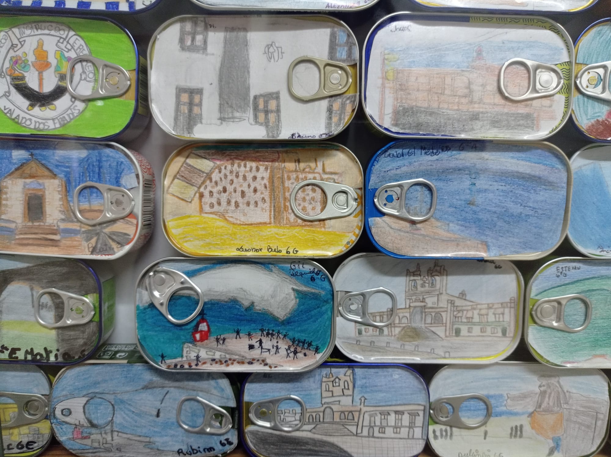 Os monumentos, as tradições, o promontório, o peixe, as ondas e o mar serviram de inspiração e, sobre o papel, os lápis de cor retrataram as imagens que decoram as latas de conserva expostas no átrio da nossa escola.